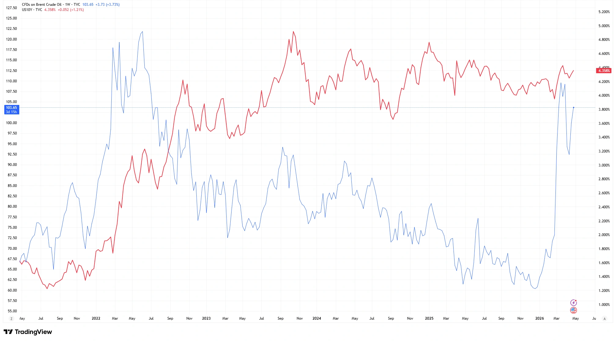 Una comparación entre el petróleo Brent y el rendimiento del bono del Tesoro estadounidense a 10 años destaca cómo el aumento de los precios de la energía suele coincidir con mayores rendimientos de los bonos, a medida que los mercados se ajustan a presiones inflacionarias más fuertes y condiciones monetarias más restrictivas.