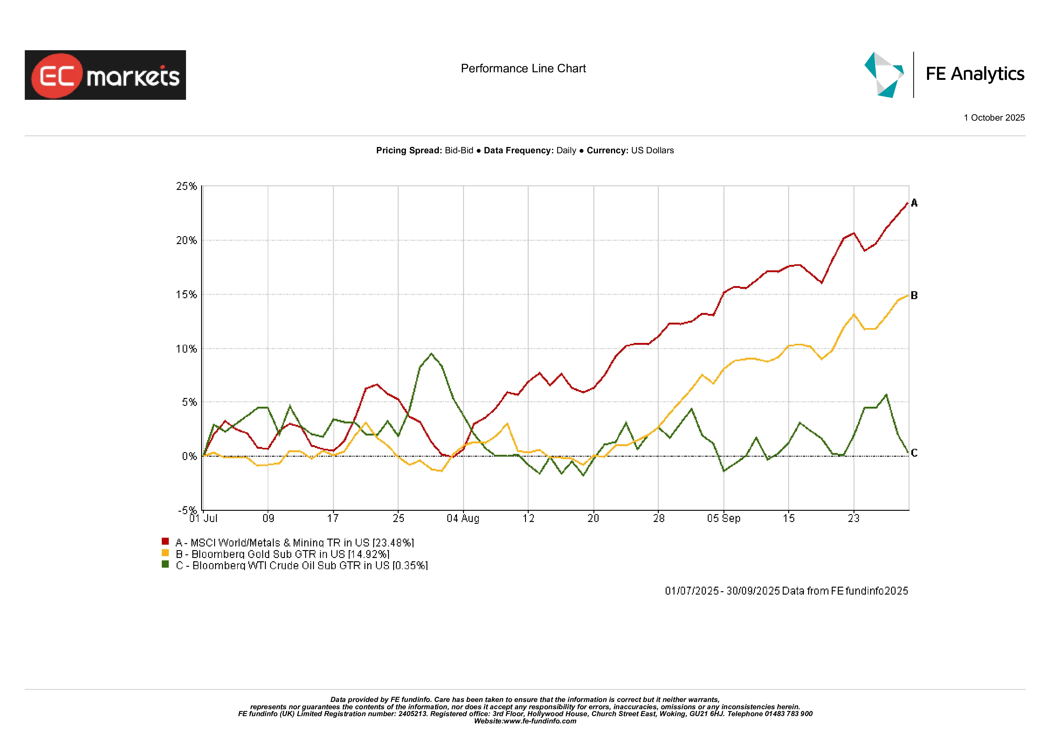 La Energía se Estanca, los Industriales se Disparan: El petróleo terminó el trimestre prácticamente sin cambios tras una volatilidad previa. Una mezcla equilibrada de retórica de la OPEP+, oferta estable y expectativas de demanda moderada mantuvo al WTI en rango. En cambio, los metales industriales registraron ganancias explosivas, con el índice MSCI World Metals & Mining subiendo más del 23 %. El estímulo de infraestructura, la relocalización de la producción y el apoyo político chino impulsaron el repunte, subrayando una fuerte demanda cíclica.