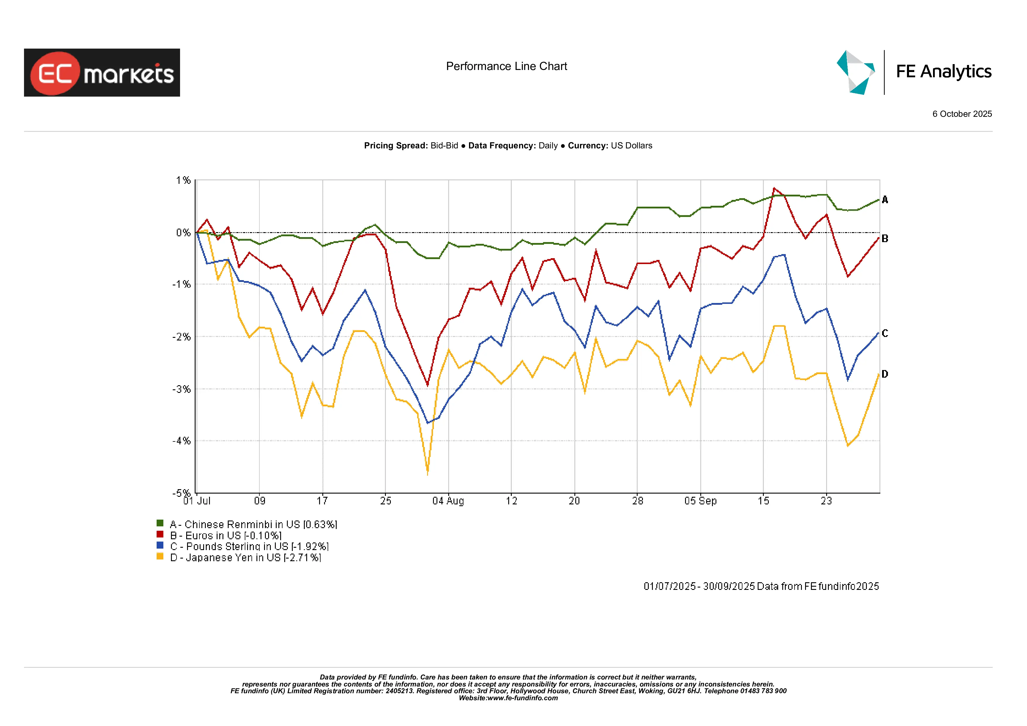 Movimientos de Divisas Moderados pero Divergentes: Los cambios en las monedas fueron más medidos. El dólar estadounidense se fortaleció ligeramente, aunque las ganancias se concentraron frente al yen, que cayó un 2.7 % mientras las operaciones de “carry trade” seguían dominando. El euro se mantuvo plano, mientras que la libra perdió casi un 2 % por las señales moderadas del Banco de Inglaterra. El yuan chino se estabilizó con una modesta ganancia del 0.6 %, reflejando credibilidad en la política. Las divisas de los mercados emergentes se fortalecieron en general, ayudadas por entradas de capital y el atractivo de mayores rendimientos reales.