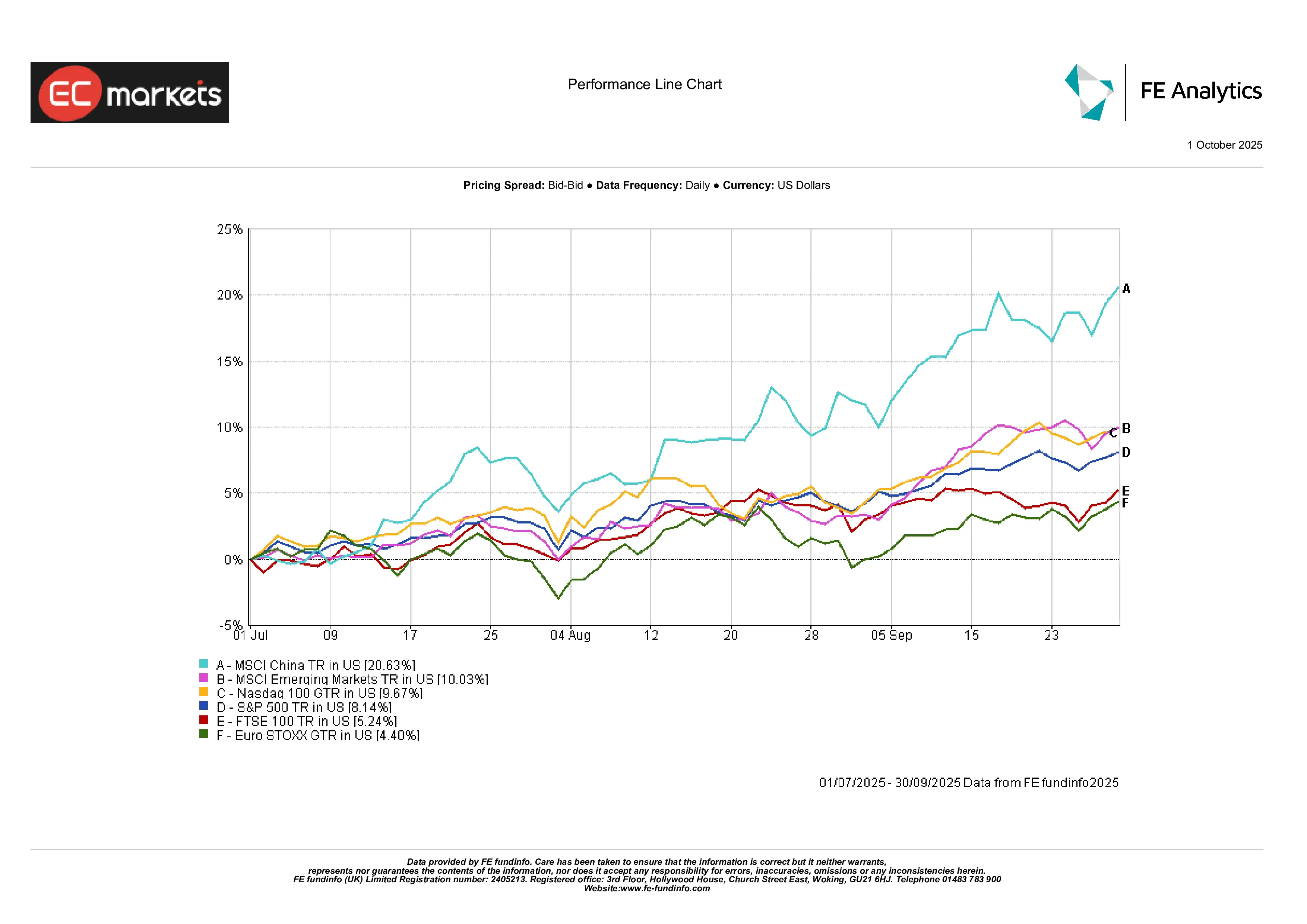Asia y Mercados Emergentes: Asia se robó el protagonismo. El MSCI China se disparó un 20.63 % mientras Pekín implementaba una flexibilización moderada y mejoraba el sentimiento. El índice MSCI EM más amplio subió un 10.03 %, impulsado por el fuerte desempeño en Asia y América Latina. Corea y Taiwán se beneficiaron del ciclo de semiconductores, mientras que India hizo una pausa tras su fuerte avance, ya que las valoraciones alcanzaron los fundamentos. El mensaje fue claro: el apoyo político y el impulso relativo del crecimiento atrajeron capital de nuevo hacia los mercados emergentes, con el repunte de China como punto destacado.