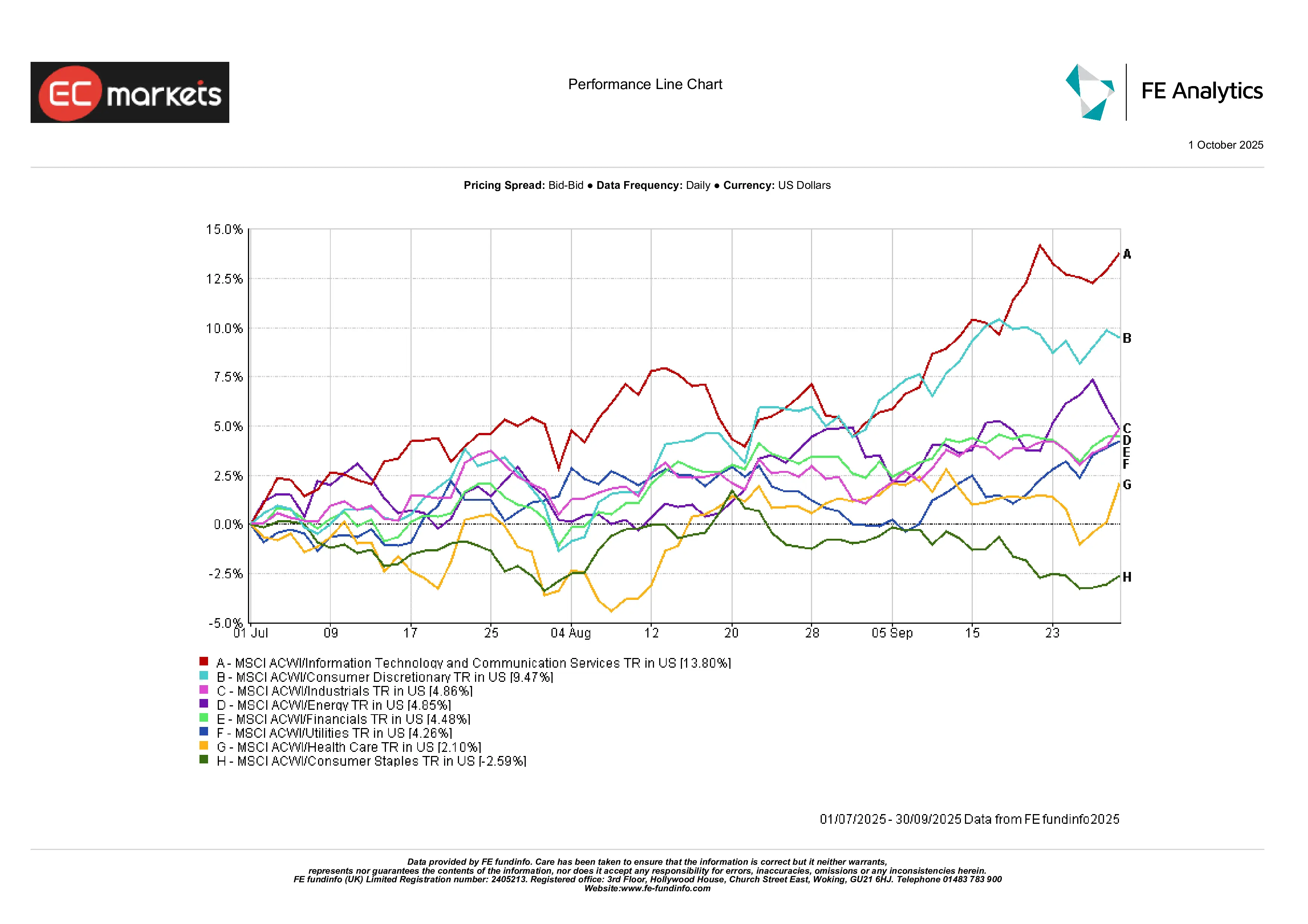 El Crecimiento Lidera Nuevamente: El tercer trimestre vio a los sectores de crecimiento retomar el control. Tecnología y servicios de comunicación se dispararon, con los índices globales ACWI mostrando ganancias del +13.8 %. Las empresas con sólidos resultados de beneficios captaron la mayor atención de los inversores. En cambio, las firmas de crecimiento especulativo sin flujos de efectivo claros quedaron rezagadas.