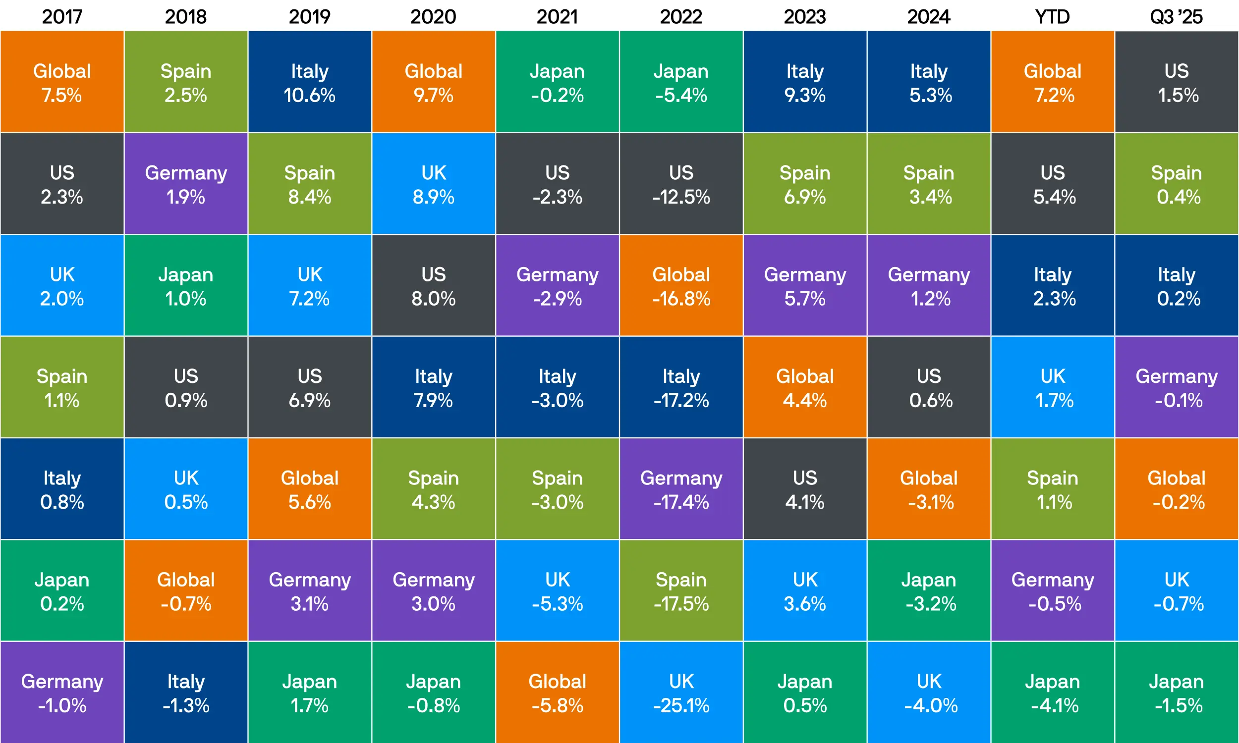 Fuente: Bloomberg, LSEG Datastream, J.P. Morgan Asset Management. Todos los índices son índices de referencia de bonos gubernamentales de Bloomberg. Los rendimientos totales se muestran en moneda local, excepto los globales, que están en dólares estadounidenses. El rendimiento pasado no es un indicador confiable del rendimiento futuro. Datos al 30 de septiembre de 2025.