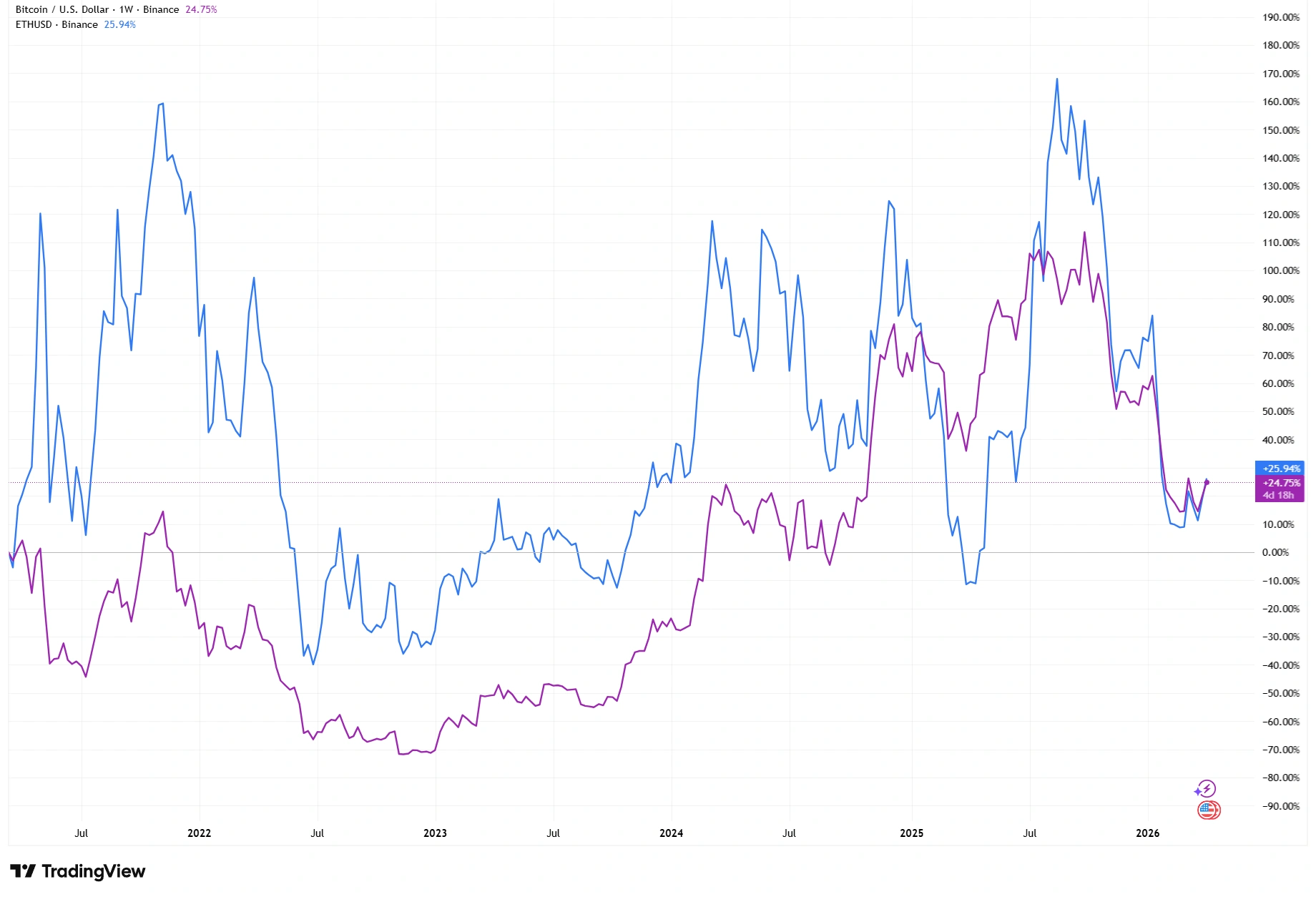 Plus récemment, le Bitcoin et l’Ethereum ont affiché des performances similaires au cours de l’année écoulée. Leurs mouvements de prix ont largement évolué de manière parallèle, reflétant une forte participation sur l’ensemble du marché crypto plutôt qu’un leadership d’un seul actif.