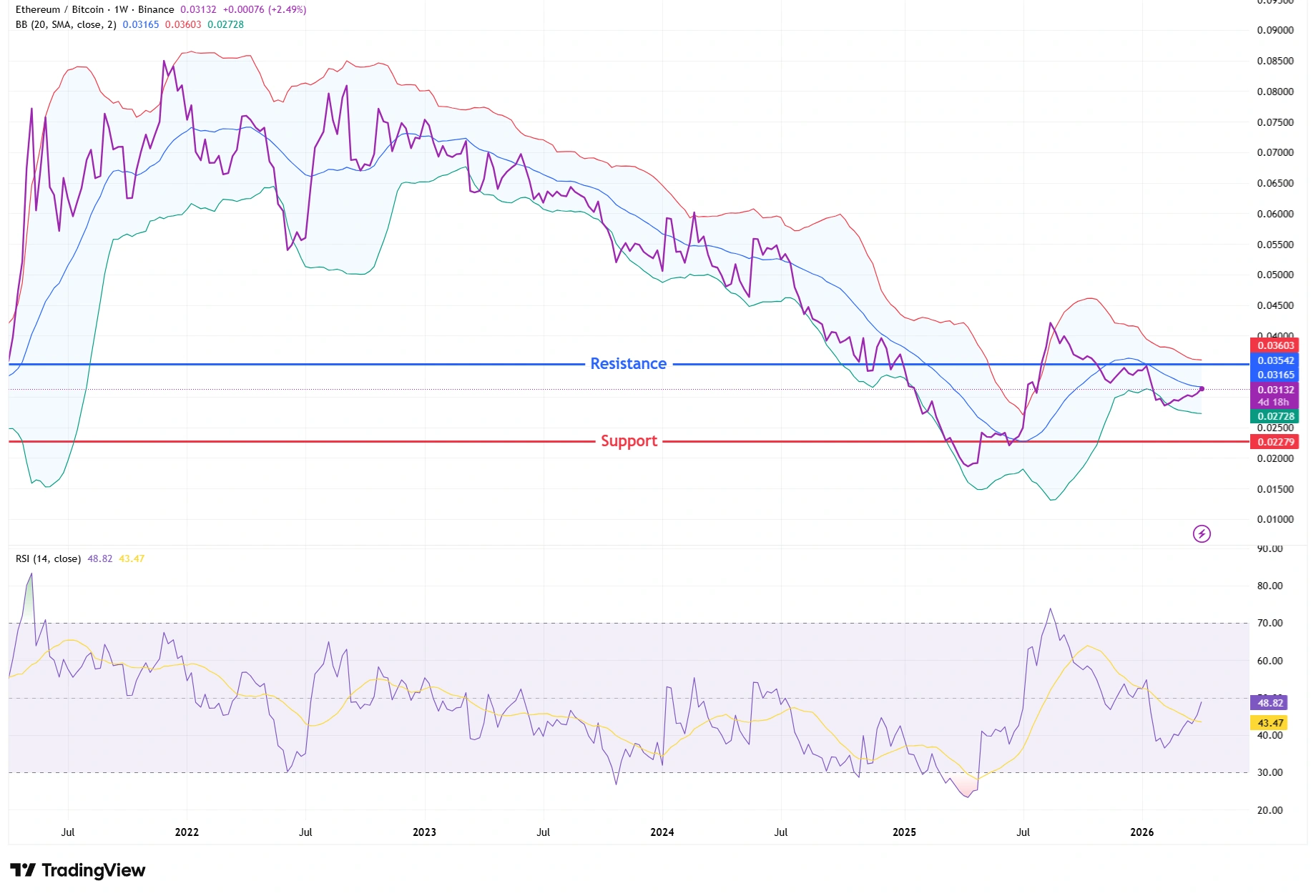 Pour cette raison, les traders regardent souvent au-delà des graphiques de prix des actifs individuels et surveillent plutôt le ratio ETH/BTC. Ce ratio montre comment l’Ethereum performe par rapport au Bitcoin en mesurant combien de Bitcoin sont nécessaires pour acheter un Ethereum. Lorsque le ratio augmente, l’Ethereum surperforme le Bitcoin. Lorsqu’il diminue, le Bitcoin gagne en force relative.
