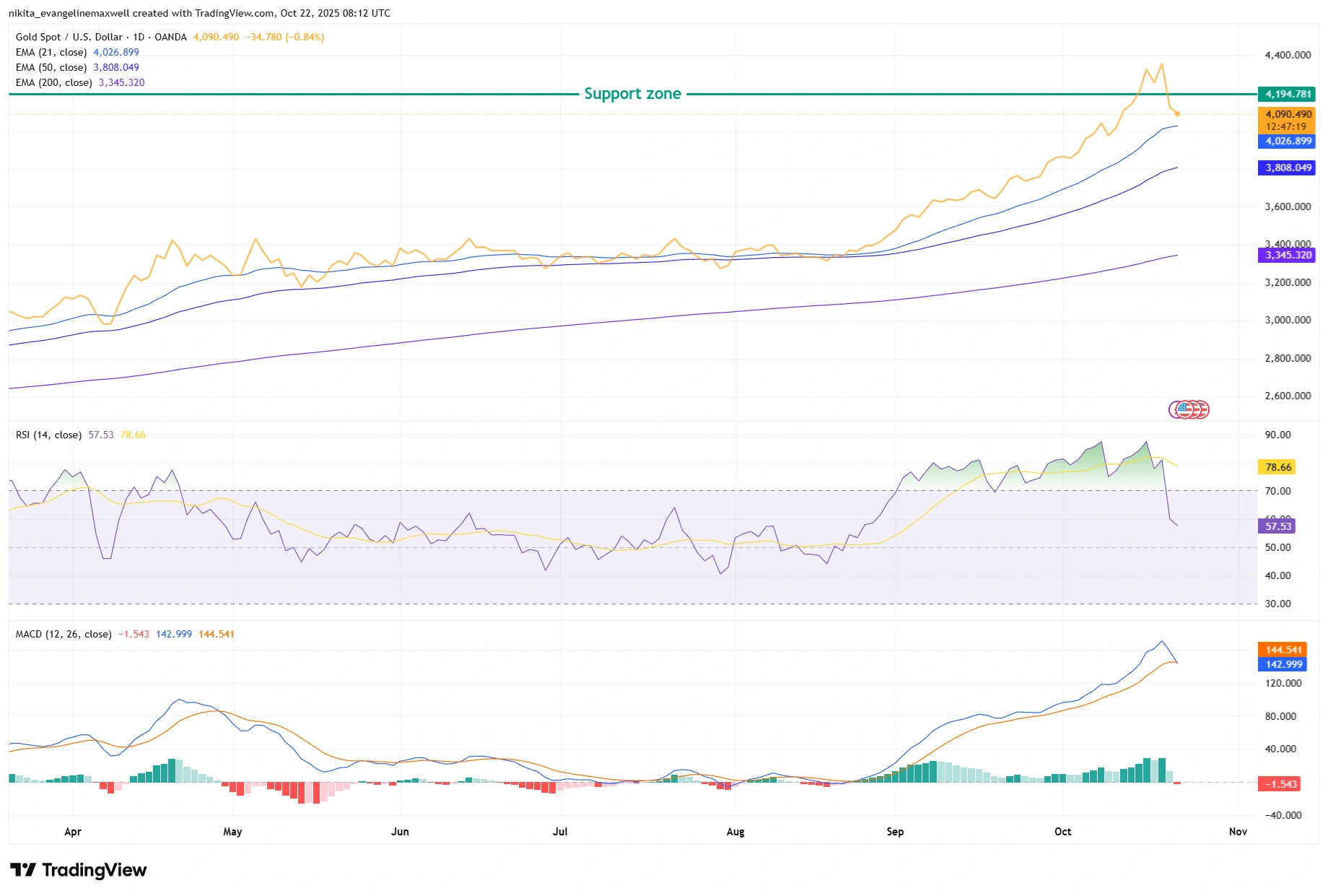 截至 2025 年 10 月 21 日,黃金在兩天的下跌後正在測試關鍵支撐位。日線圖顯示,黃金從近期約 4,380 美元的歷史高位回落,重新接近其先前的支撐區間 4,100–4,200 美元。在此之前,價格沿著明確的上升趨勢線創出更高高點,並始終位於其中長期移動平均線(21、50 和 200 日均線)之上。交易者指出,關鍵技術支撐位大約在 10 月 14 日低點(約 4,095 美元)以及 10 月 20 日附近區域(約 4,190 美元)。