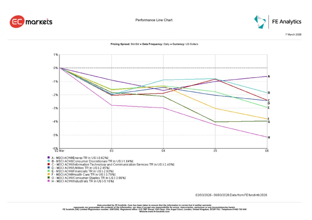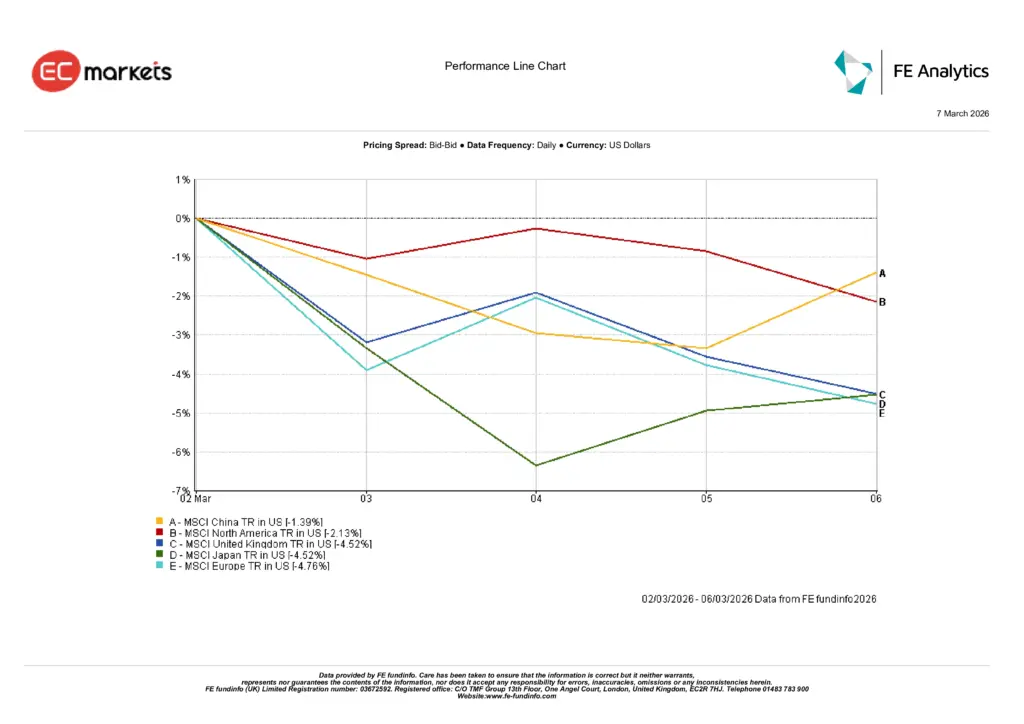 英國與日本均收於 -4.52%,反映投入成本上升帶來的利潤壓力以及對利率變動的敏感性。歐洲下跌 -4.76%,成為主要區域中表現最弱的一個。原因是能源依賴度較高,加上主權殖利率出現更明顯的重新定價。結果是投資者在考慮更緊縮的金融條件與第二輪通膨風險時,估值出現更深幅度下調。