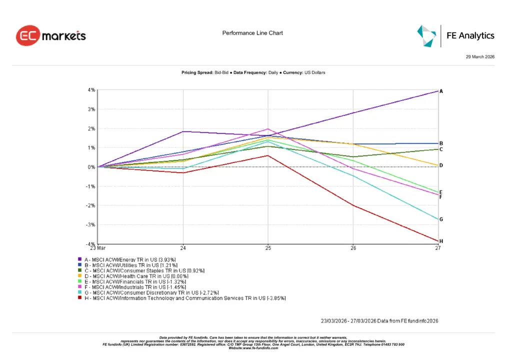 Energy was the standout performer, with the MSCI ACWI Energy sector rising roughly 3.9% during the week as higher oil prices strengthened earnings expectations for producers. The cause was continued strength in crude prices. The effect was investor rotation toward sectors with direct commodity exposure.