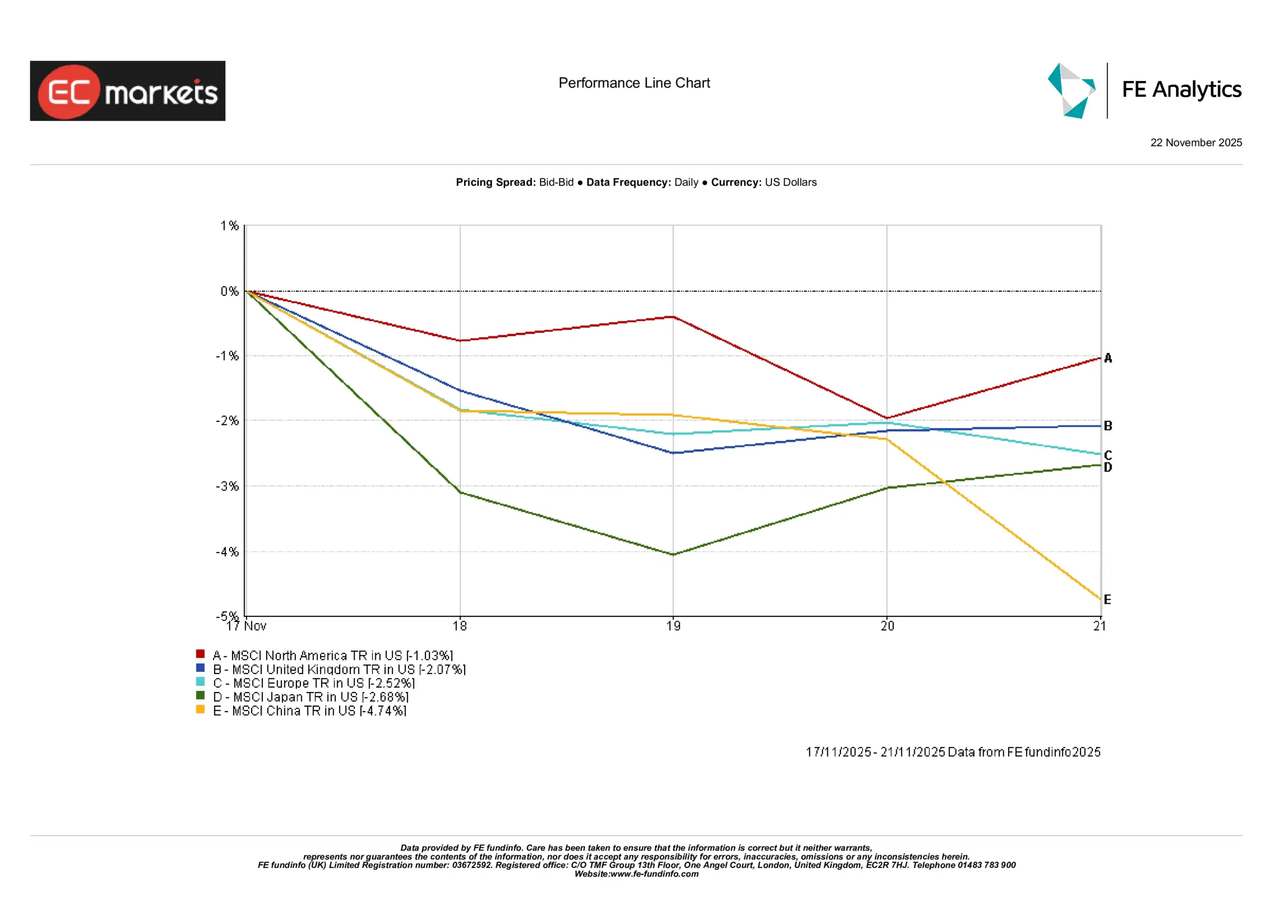 The spotlight shifts to delayed US data and central bank signals. Markets await October’s nonfarm payrolls, inflation, retail sales, and industrial output, pushed into late November and early December due to the shutdown. Flash PMIs (due 24 November) in the US and Europe will offer clues on near-term momentum. In China, early December’s Caixin PMIs will be closely watched for evidence of stabilisation or further stimulus needs.