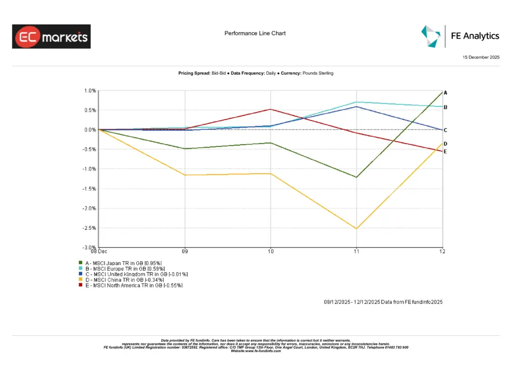 Japan led regional returns, with the MSCI Japan up 0.95% (GBP), supported by yen strength and growing expectations that the Bank of Japan may deliver a rate hike. Europe ex-UK followed, gaining 0.59%, as investors cautiously positioned ahead of the ECB’s final meeting of the year.