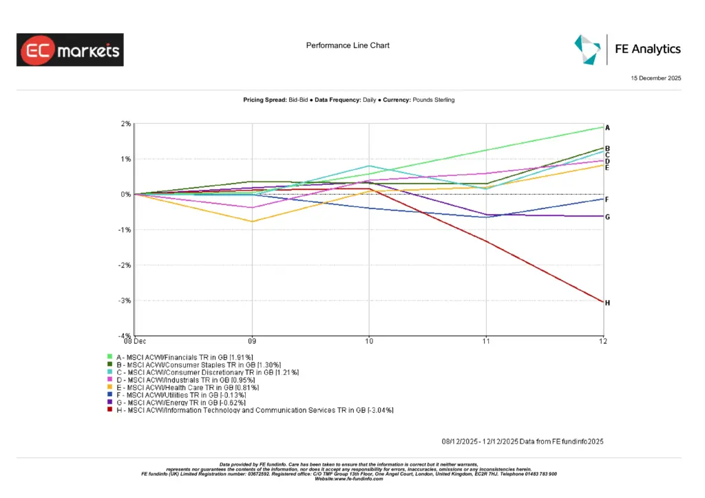 Financials led gains, rising 1.91%, as easing policy and improved risk sentiment favoured value-oriented sectors. Consumer Staples advanced 1.30%, reflecting renewed demand for defensive income, while Consumer Discretionary gained 1.21%, supported by expectations that lower rates may help stabilise household spending into 2026.