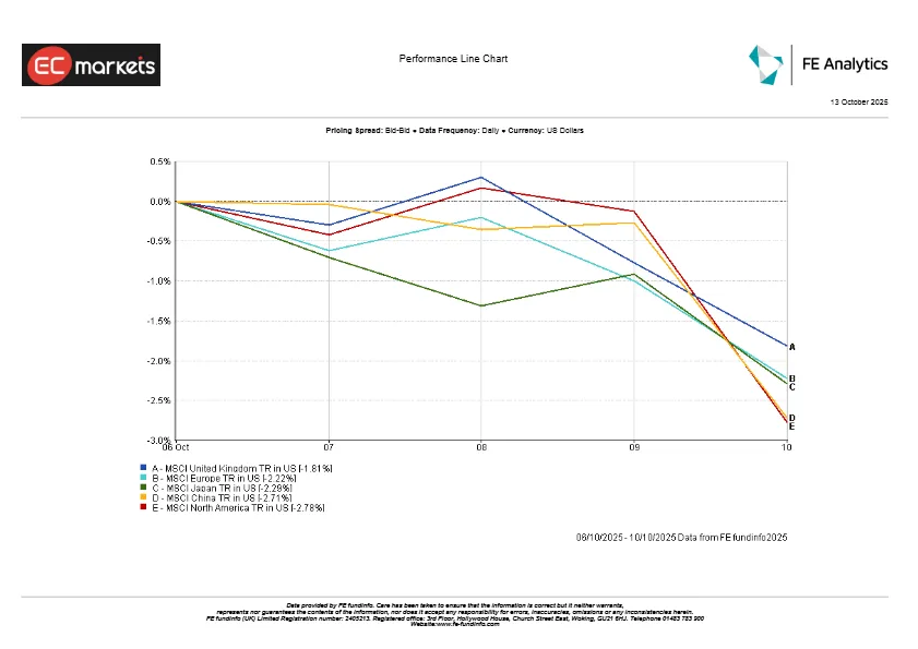 North America led the declines, with the MSCI North America index down about 2.8% as tech weakness dragged broader markets lower. China followed closely, slipping 2.7% despite earlier optimism around policy support. Japan lost roughly 2.3%, weighed by political uncertainty, while Europe fell around 2.2%, cushioned slightly by its value bias and softer euro. The UK held up best, easing just 1.8% thanks to its defensive tilt in energy, mining, and consumer staples.