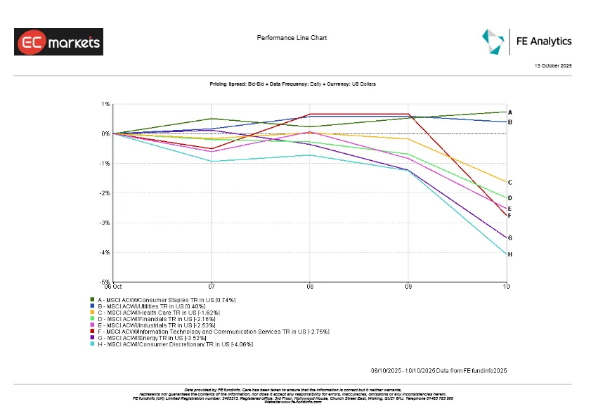 The tone across sectors shifted back toward safety. Utilities and Consumer Staples led globally as lower yields and renewed volatility steered investors into defensive corners. In Europe, utilities logged their best performance in over a month, while major food and beverage names gained on consistent earnings and stable demand.