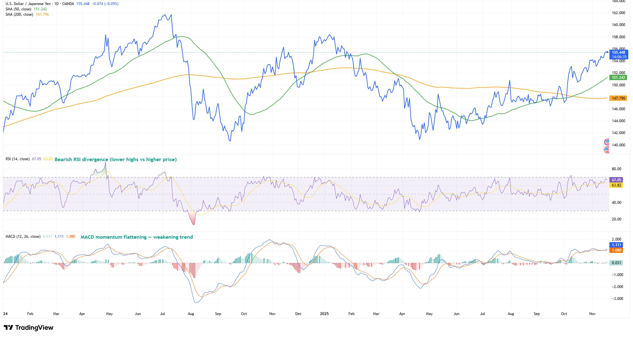 USD/JPY has been on a rocket ride, but the slope is flattening. Daily charts still show higher highs, yet momentum is fading. RSI has been stuck in overbought territory and even slipping lower while prices push up (a classic bearish divergence!). MACD bars are shrinking (as seen in the chart below), and those long upper wicks on recent candles? They scream hesitation. In short: the parabolic curve is bending. Late buyers are climbing a steeper hill with less oxygen.
