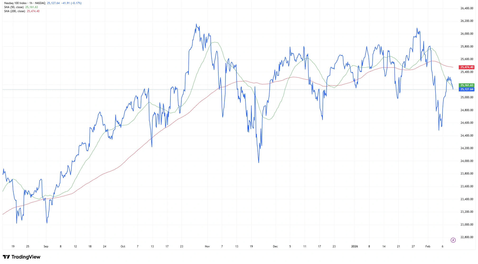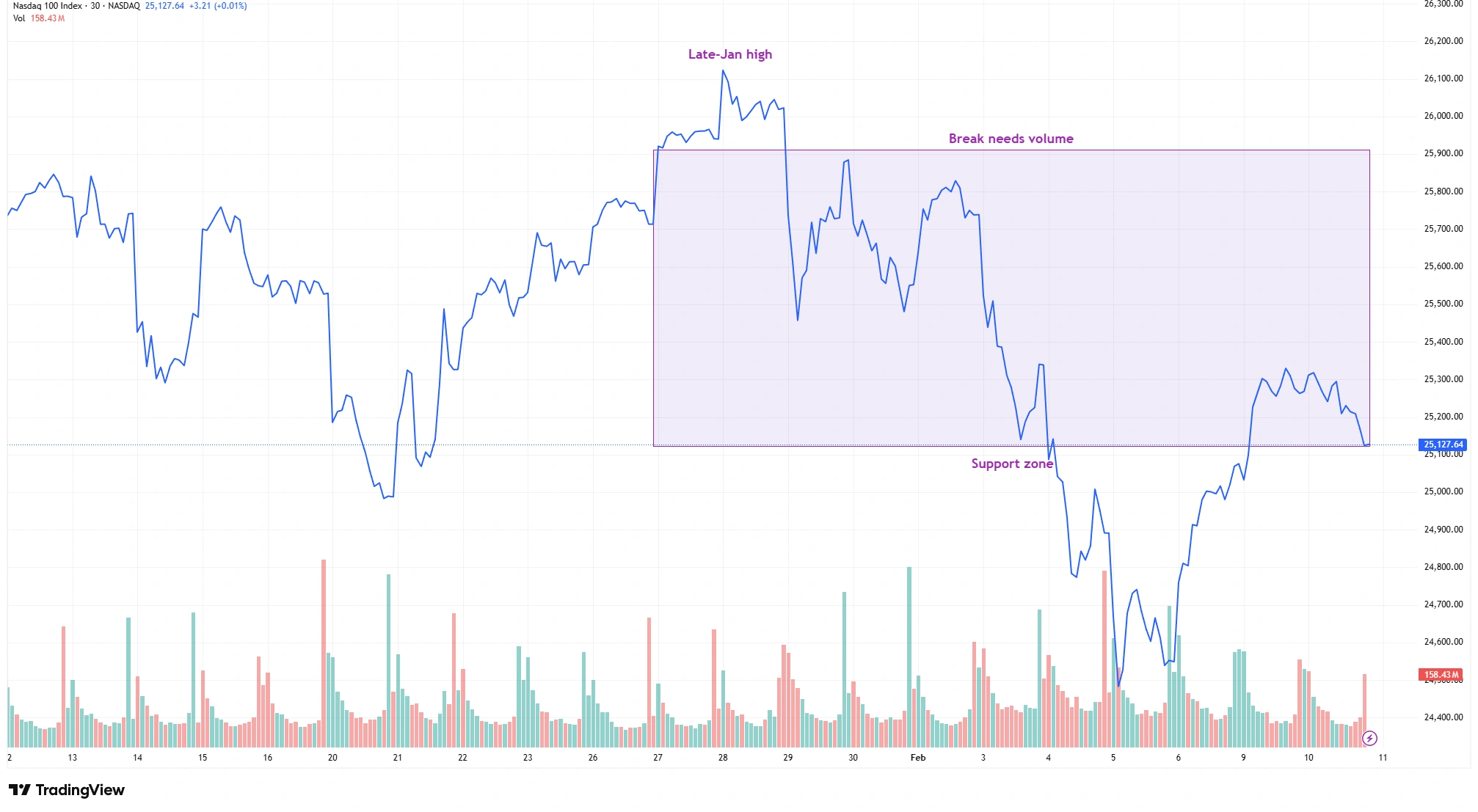 The bullish case strengthens if the Nasdaq 100 can push above 25,900-26,200 with stronger volume.