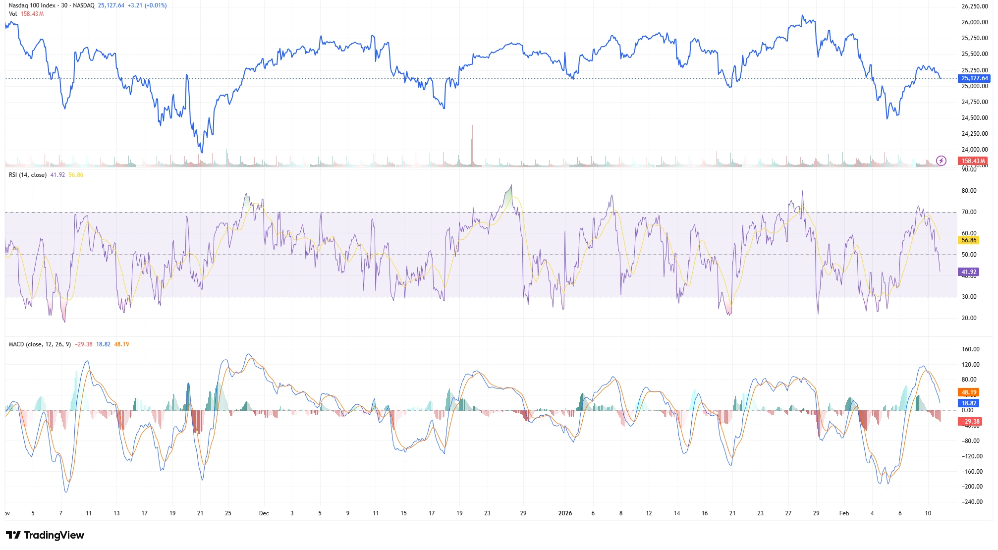 - Consolidation quality: Since late January, the Nasdaq 100 has been moving in a steady, narrow range around the mid‑25,000s. This kind of calm, sideways action is common when the market is simply “catching its breath” after a strong run. Several tracking tools still show a generally neutral‑to‑positive outlook, which fits with a market preparing for its next move.
