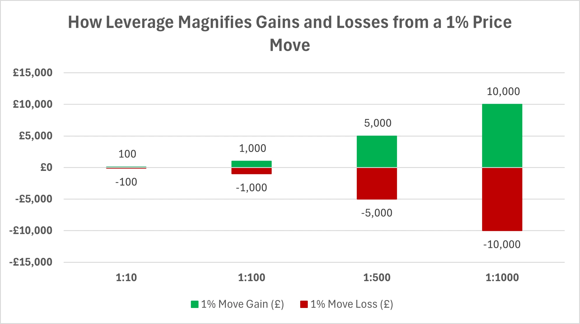 The chart below shows how a 1% price move can affect a £1,000 account at different leverage levels. As leverage increases, both potential gains and losses rise dramatically – a clear reminder of how “too much” can quickly become dangerous.