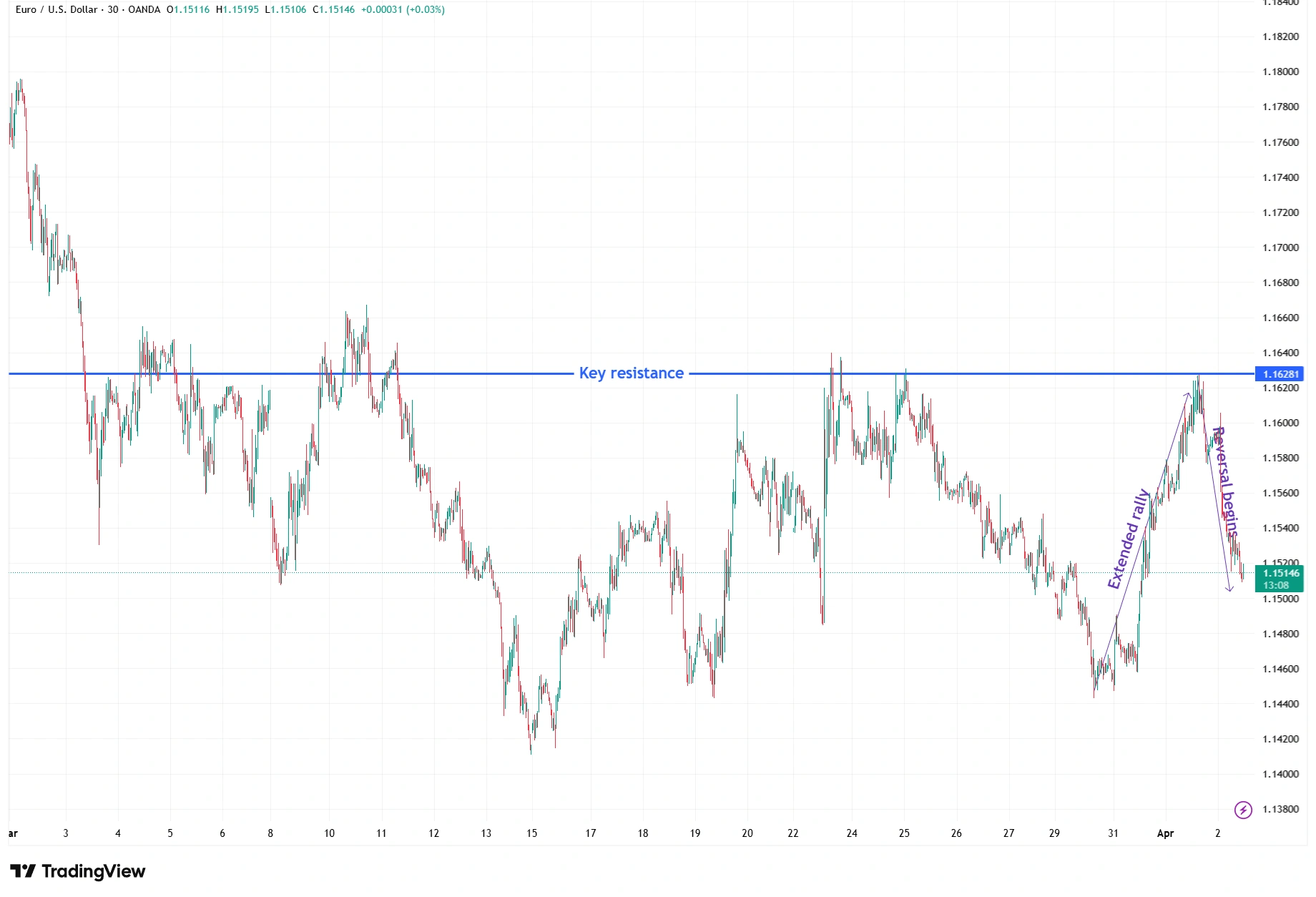 EUR/USD rallies into a key resistance level before reversing lower, illustrating how profit-taking and positioning adjustments can shift market direction even without a major news catalyst.