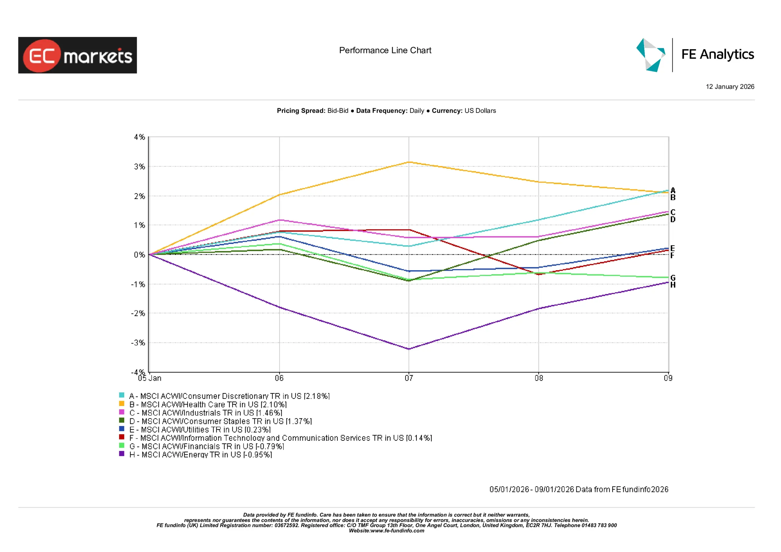 セクター別の動きはより明確な差別化を示し、広範なリスク選好よりも、消費者の底堅さや利益の可視性に対する需要が主導した。一般消費財が+2.18%と上昇を主導し、12月下旬の軟調さの後、消費関連銘柄へのセンチメントが安定した。ヘルスケアは+2.10%上昇し、依然として不透明なマクロ環境の中で、防御的な収益特性の恩恵を受け続けた。