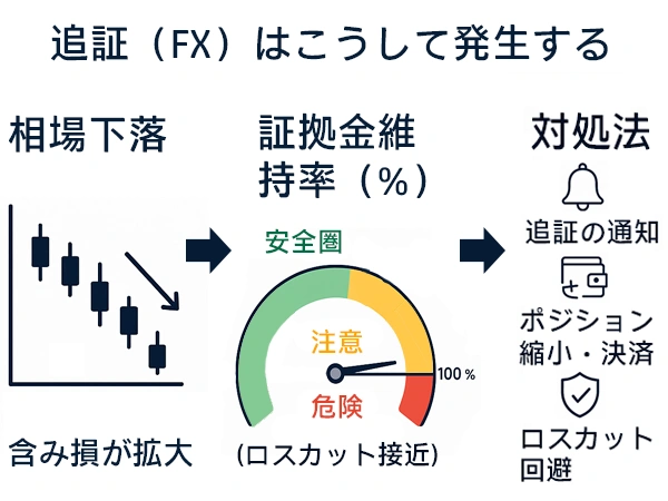 FXにおける「追証(マージンコール)」は、リスク管理の要です。証拠金維持率を下回ると追加の入金が必要になり、未対応のまま放置すると強制ロスカットとなってしまいます。