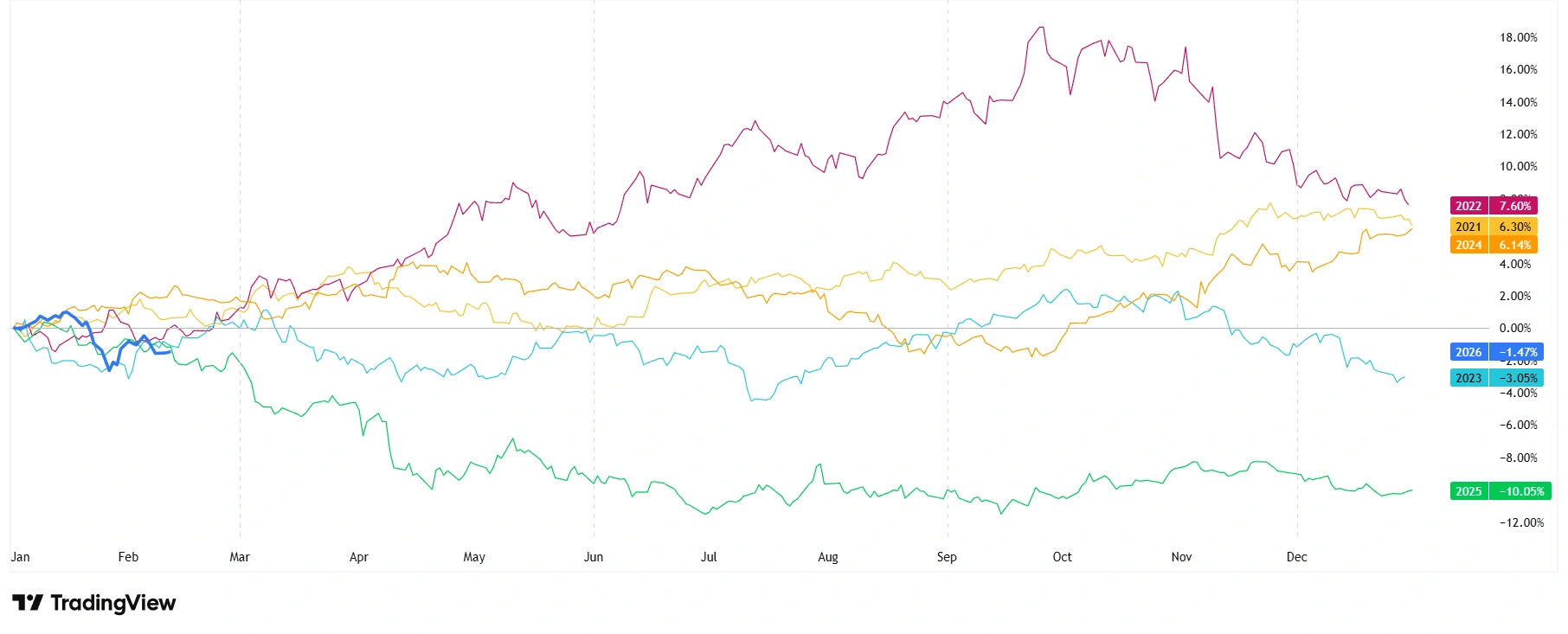 출처: TradingView. 모든 지수는 미국 달러 기준 총수익입니다. 과거 실적은 미래 성과를 보장하지 않습니다. 데이터 기준일: 2026년 2월 12일.