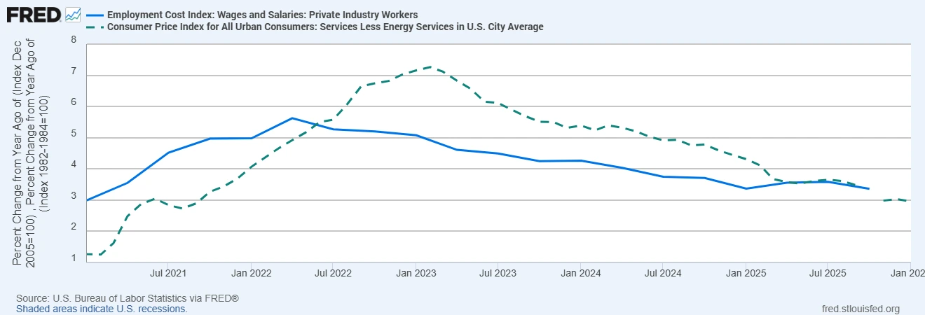Gaji berada di pusat harga perkhidmatan kerana buruh adalah kos input utama. Indeks Kos Pekerjaan menunjukkan gaji dan upah sedikit melebihi 3% tahun ke tahun dan bayaran bagi pekerja yang kekal dalam pekerjaan adalah lebih kukuh. Pertumbuhan gaji biasanya ketinggalan berbanding penyejukan pasaran buruh kerana firma mengekalkan pekerja selepas kitaran pengambilan yang sukar, perubahan gaji minimum menaikkan paras asas, dan jurang kemahiran mengekalkan tekanan terhadap peranan tertentu. Oleh itu, disinflasi gaji mengambil masa, yang mengekalkan inflasi perkhidmatan teras pada paras tinggi walaupun CPI keseluruhan melembut. Inilah sebabnya dinamik gaji sering menentukan seberapa cepat atau lambat bank pusat boleh menurunkan kadar faedah.