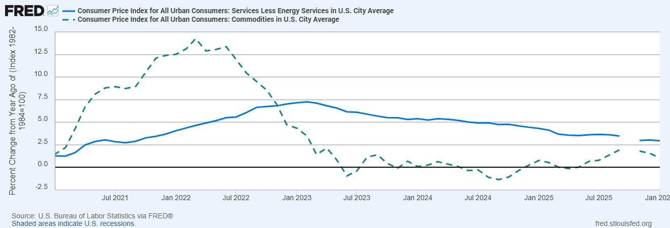 Perkhidmatan berkelakuan berbeza daripada barangan kerana ia didorong oleh tenaga kerja, premis, dan kontrak. “Perkhidmatan tidak termasuk tenaga” berada hampir 3% tahun ke tahun, dan tempat tinggal sedikit melebihi paras itu. Ia bersifat melekit kerana sewa dan sewa tersirat diselaraskan semula apabila kontrak diperbaharui, penjagaan kesihatan dan insurans mengikut kontrak berbilang tahun, dan pengangkutan serta pendidikan adalah intensif buruh serta sering terhad oleh kapasiti. Akibatnya, harga perkhidmatan menyesuaikan diri secara beransur-ansur, yang memperlahankan fasa akhir disinflasi walaupun harga barangan telah kembali normal. Oleh kerana perkhidmatan membentuk bahagian lebih besar dalam bakul CPI berbanding barangan, pelarasan yang perlahan ini memberi kesan yang lebih besar terhadap laluan inflasi keseluruhan.