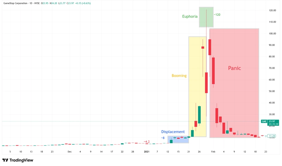 ตัวอย่างที่เป็นที่รู้จักคือการพุ่งขึ้นอย่างรวดเร็วของหุ้น GameStop ในช่วงต้นปี 2021 การเคลื่อนไหวดังกล่าวถูกขับเคลื่อนเป็นหลักโดยการเก็งกำไรและการซื้อขายที่ได้รับแรงกระตุ้นจากโซเชียลมีเดีย มากกว่าปัจจัยพื้นฐานของธุรกิจ เมื่อแรงซื้อเริ่มชะลอลง ราคาก็ปรับตัวลงอย่างรวดเร็วเช่นเดียวกับตอนที่เพิ่มขึ้น แสดงให้เห็นว่าการเคลื่อนไหวแบบฟองสบู่นั้นเปราะบางเพียงใด
