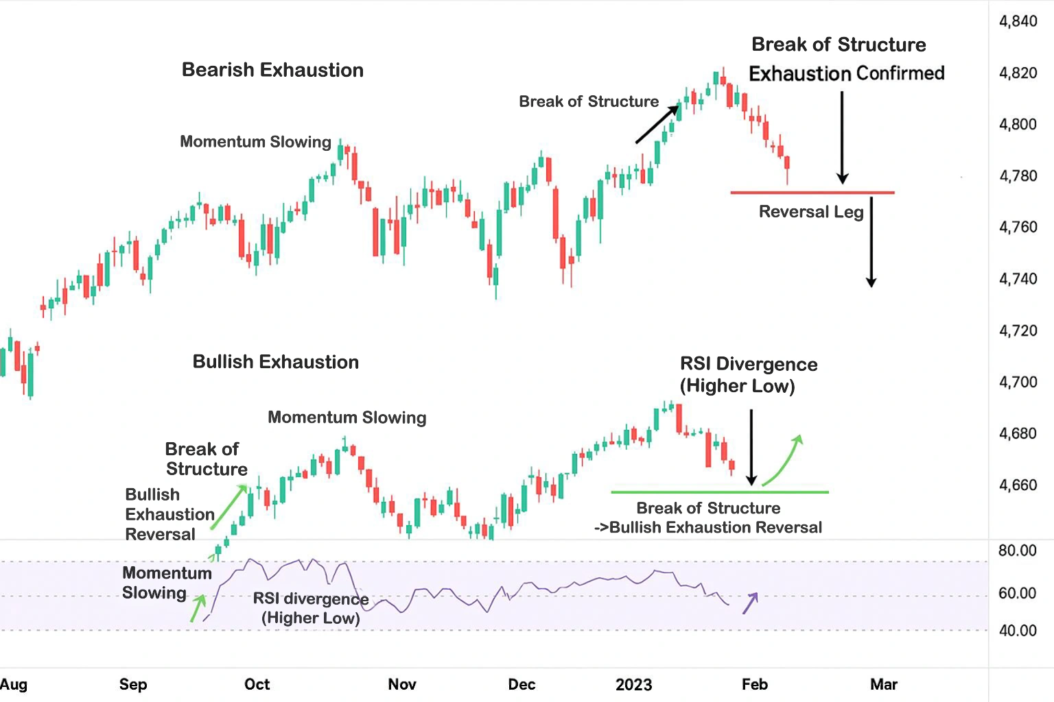 该图表展示了看涨与看跌的动能衰竭形态,包括动能减弱、RSI 背离以及随后触发反转的结构性突破。仅用于教育示例,并非基于实时市场信号。